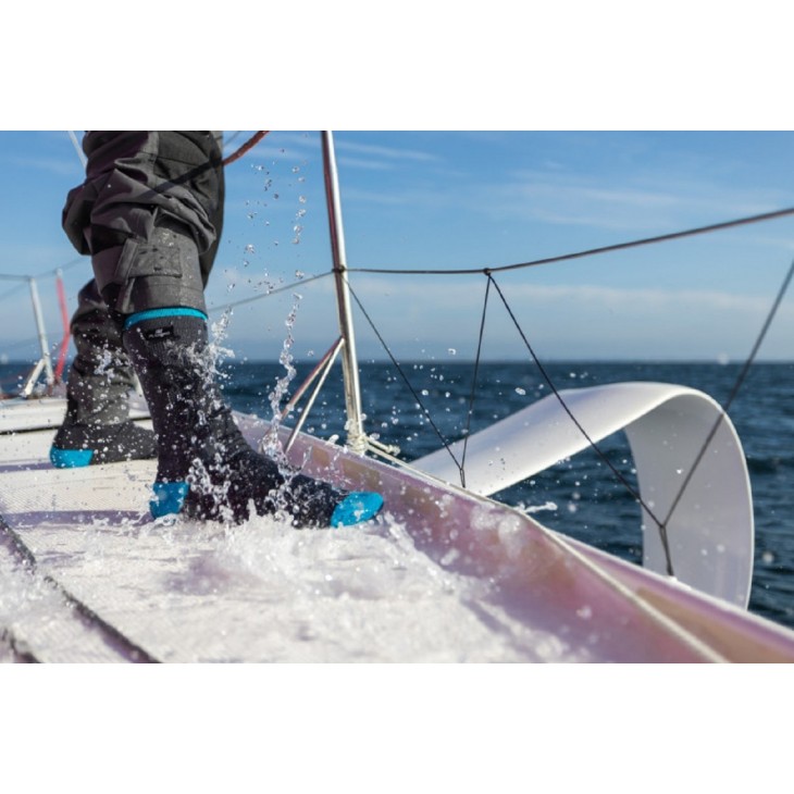 Mid-calf socks, 100 % waterproof, warm, breathable, and windproof. Merino wool limits odors, absorbs moisture, and provides thermal insulation. Keeps feet dry and warm at sea, even with deck shoes.