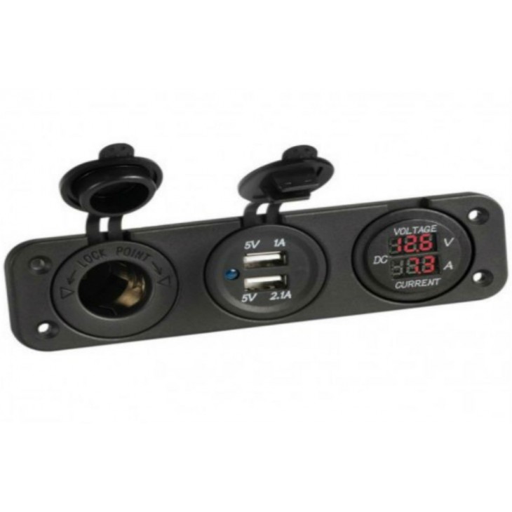 Pannello nero con voltmetro e amperometro digitale, dotato di porta USB e presa accendisigari 12V da incasso. Perfetto per monitorare tensione e corrente offrendo porte di ricarica pratiche.